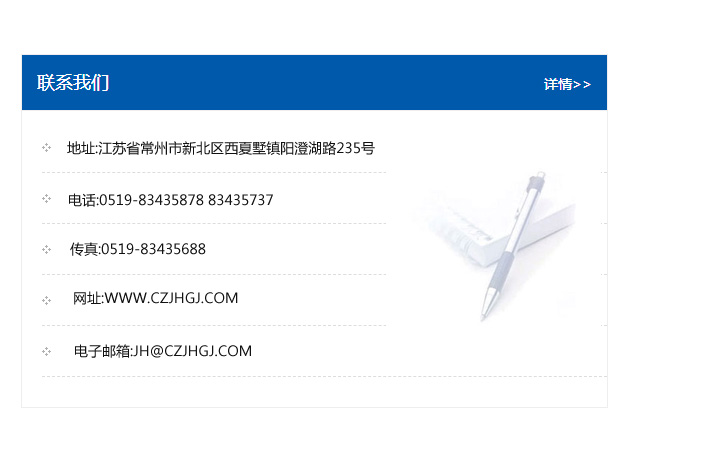 地址:常州市新北區友邦商務大廈1幢16、17層  電話:0519-85101652  傳真:0519-85112595  郵編:213022  網址:www.cz-jiayue_cn.axznkj.com  郵箱:xiajifengaa@163.com